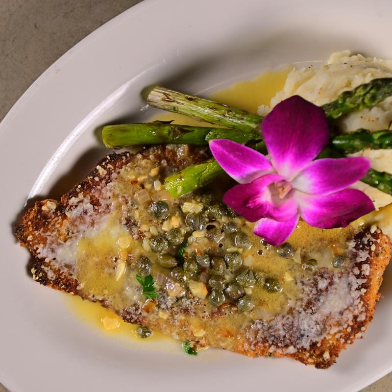 Parmesan crusted chicken piccata served over mashed potatoes with asparagus