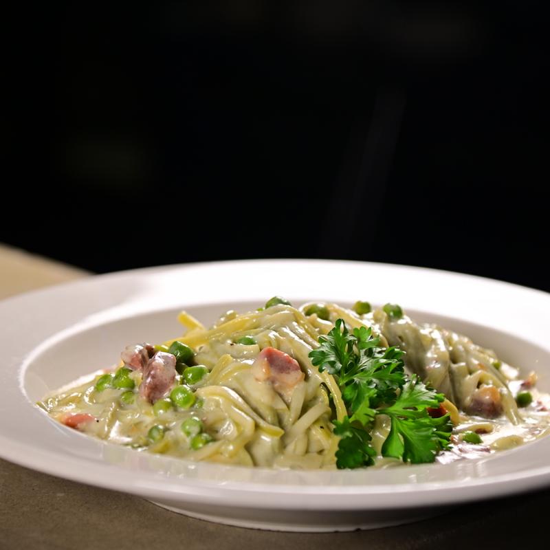 Straw and Hay pasta in a light parmesan cream sauce with peas and prosciutto di parma