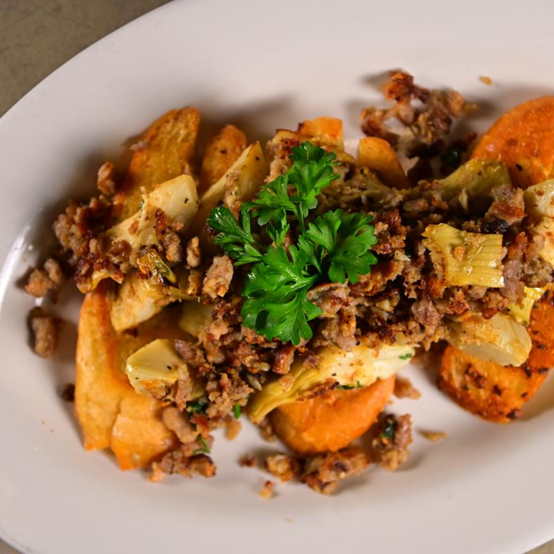 Crumbled wood fired sausage and artichoke hearts in garlic and oil over toasted crostini topped with parmigiana reggiano